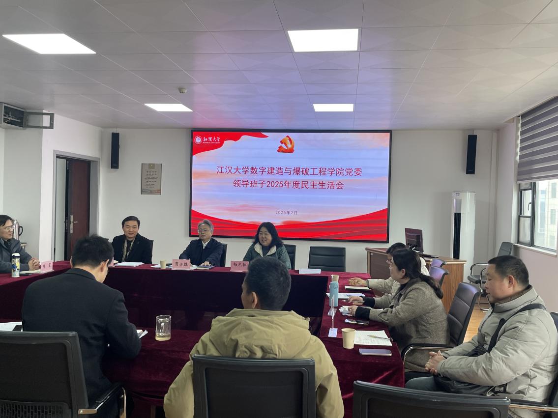2026年2月6日,数字建造与爆破工程学院党委召开2025年度党员领导干部民主生活会。本次会议以“深入学习贯彻习近平新时代中国特色社会主义思想,全面贯彻落实党的二十届四中全会精神和习近平总书记考察湖北重要讲话精神,以打攻坚战、持久战的决心和恒心,锲而不舍落实中央八项规定精神,推进作风建设常态化长效化,以优良作风凝心聚力、真抓实干,为服务湖北支点建设和武汉加快建设国家中心城市、全力打造‘五个中心’、全面建设现代化大武汉,持续推进一流学科和高水平城市大学建设新篇章提供坚强保障”为主题,严肃开展批评和自我批评,切实找准问题、深挖根源、明确方向。江汉大学副校长贾永胜莅临指导,校民主生活会第五督导组杨光敏组长到会督导,学院党委领导班子成员参加会议,会议由学院党委书记邱成超主持。