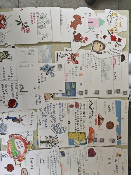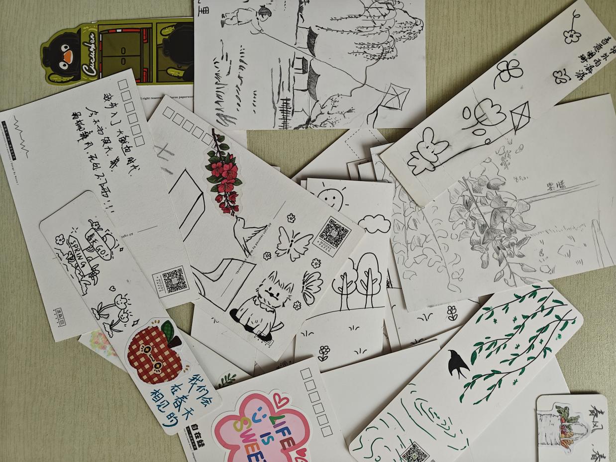 活动现场暖意融融,处处洋溢着青春与创作的热情。同学们围坐在一起,低头认真勾勒,互相交流灵感,笔尖在纸上游走,色彩在画面中绽放,不时传来轻声的讨论与欢快的笑声。最受欢迎的“春景交换”环节,让现场充满惊喜与感动:大家提交自己的作品后,随机抽取一份来自他人的手绘心意——一份创作换来一份温暖,以画会友、以美传情。