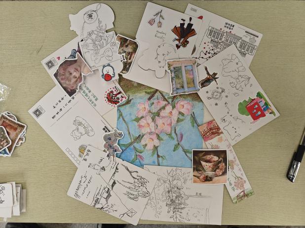 从抽芽的新绿到盛放的繁花,从标志性建筑到校园一角的小美好,皆成为大家笔下的创作灵感。师生们以书签、明信片为载体,运用手绘、涂鸦、拼贴等多样方式自由表达,用灵动的线条与缤纷的色彩,将江大春日的美好一一定格。在提笔、着色、构思的过程中,大家慢慢提升审美感知,也在艺术创作里收获轻松与愉悦。